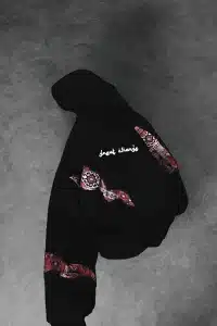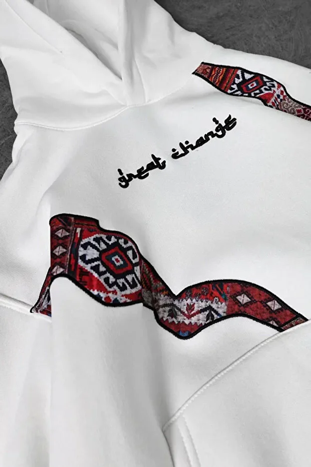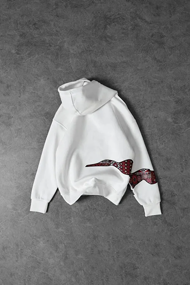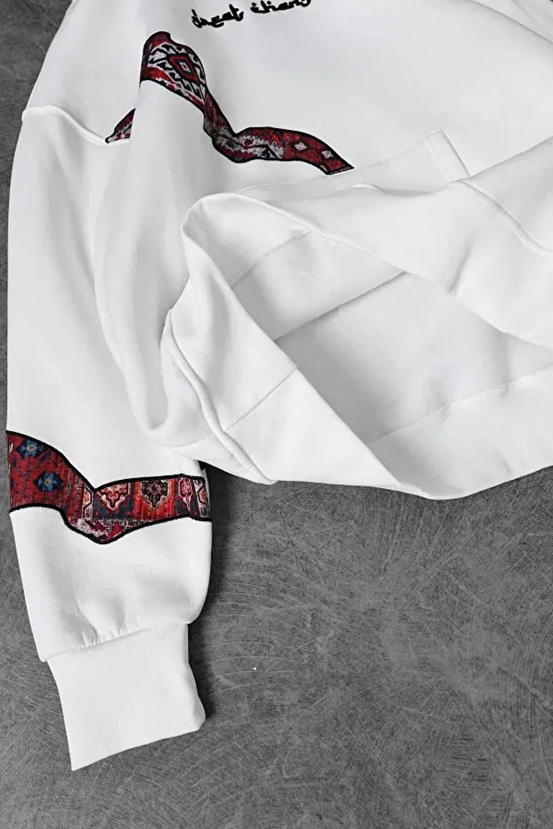 Bu beyaz kapüşonlu sweatshirt, kol ve gövde kısmındaki desenli detaylarla modern bir görünüm sunar.