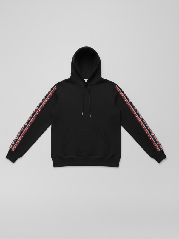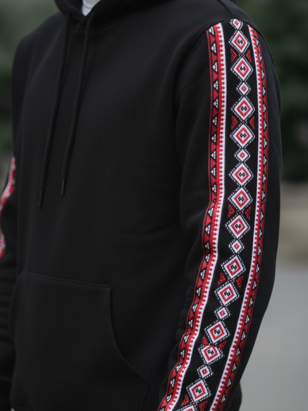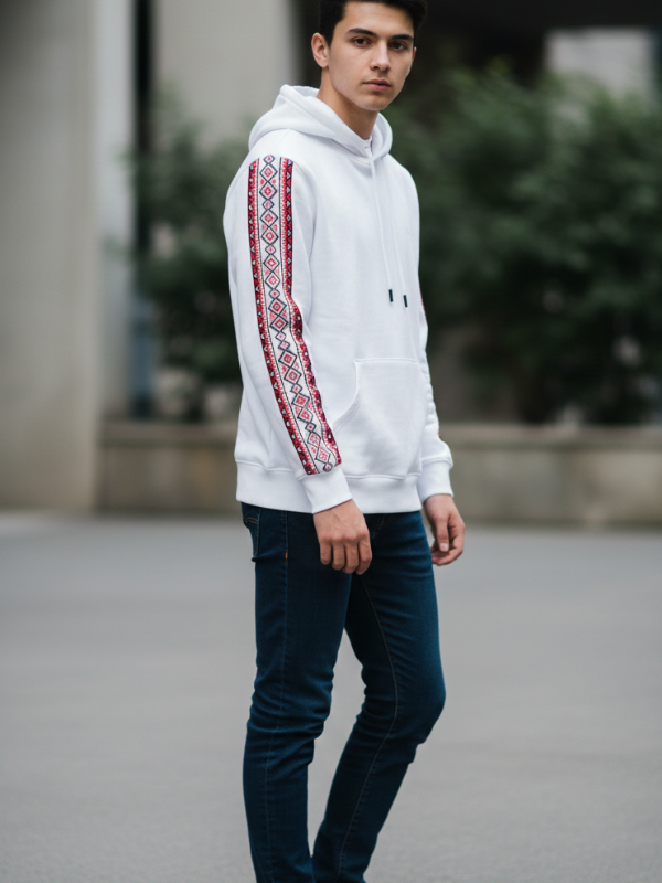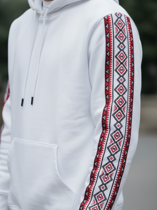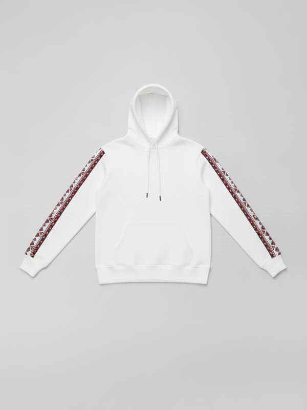 Özgün Tasarım: Her iki kolda boydan boya yer alan geleneksel motifli (etnik/geometrik) baskı detayı ile klasik beyaz hoodie'ye farklı ve dikkat çekici bir hava katar.