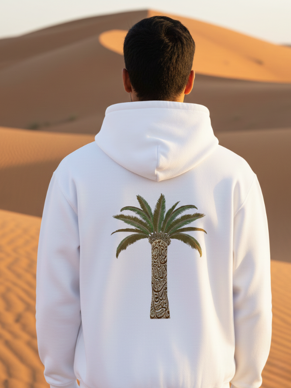 Arka Yüz Tasarımı: Ön kısmı sade bırakılmış olup, tüm dikkat arkadaki detaylı ve kültürel değere sahip Palmiye ağacı baskısına odaklanmıştır. Çöl temalı arka plan ile görsel olarak zenginleştirilmiştir.