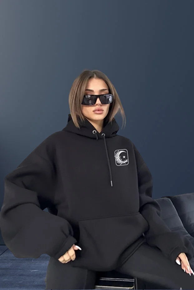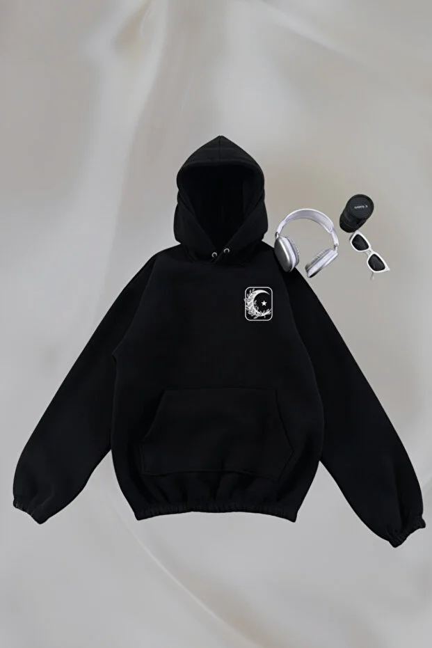 Kapüşonlu Fermuarlı Maske Sweatshirt – Ay ve Yıldız Baskılı