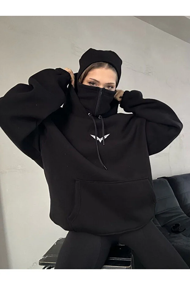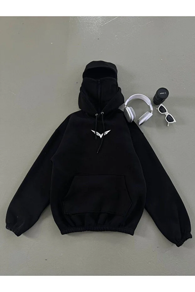 Origami Baskılı Maskeli Dikay Kapüşonlu Sweatshirt Hoodie