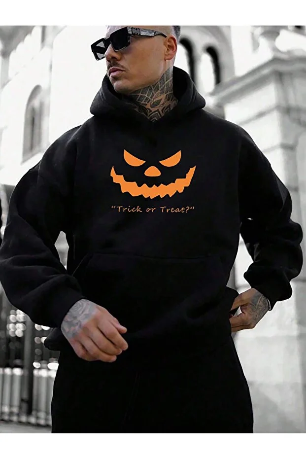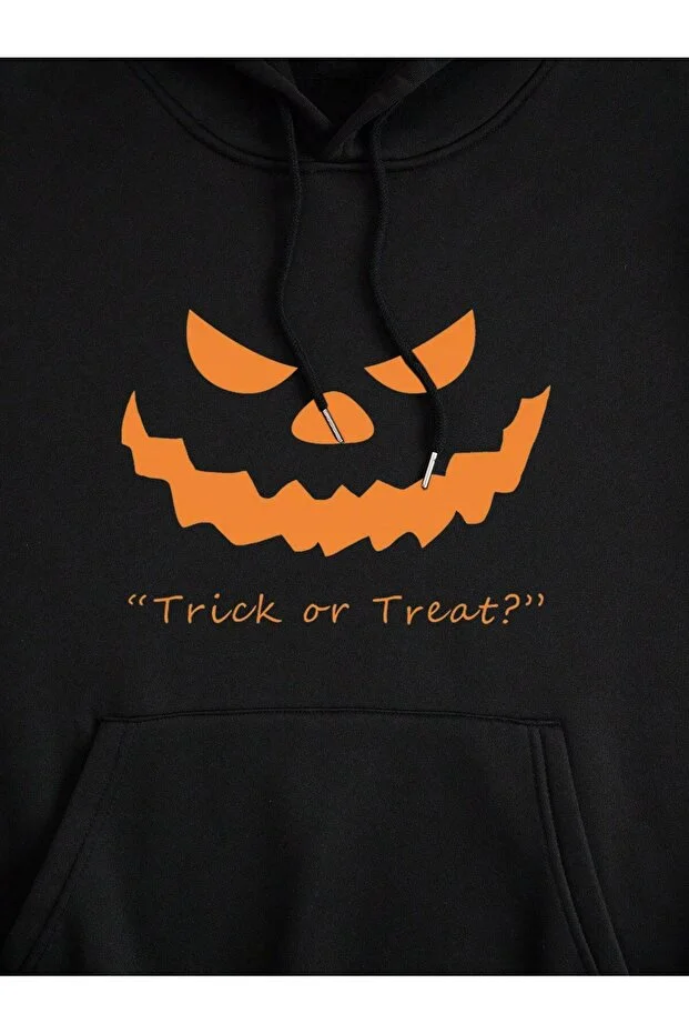 trick or treat hülen yüz halloween ön baskılı siyah oversize kapşonlu sweatshirt hoodie