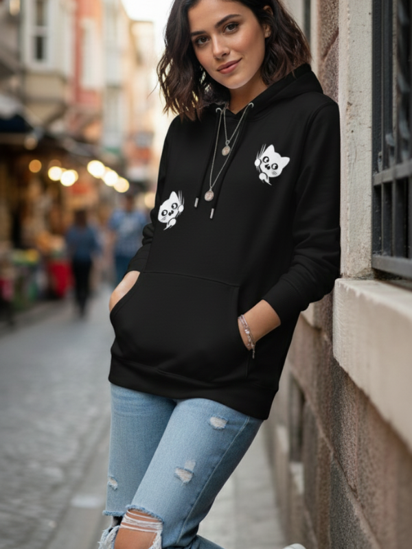Eğlenceli Baskı: Ön kanguru cebin iki yanından gözetleyen ve küçük pençe izleri (pati) ile tutunmaya çalışan iki sevimli siyah kedi figürü baskısı bulunur. Eğlenceli ve dikkat çekici bir tasarımdır.